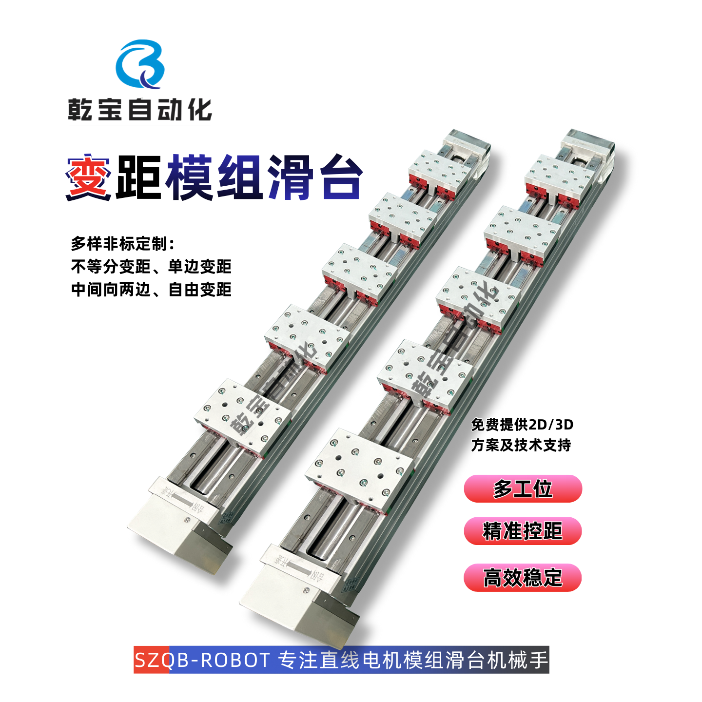 变距模组Variable Distance Module实现不等分变距、单边变距、中间向两边、自由变距的多工位精准控距直线模组